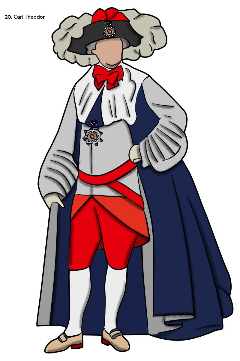 Ein elfköpfiges Recherche-Team aus dem MARCHIVUM ist in die zeitgenössischen Quellen wie Reiseberichte, Memoiren und Selbstzeugnisse, Gerichtsakten, Amtsbücher, Verordnungen sowie Forschungsliteratur über das 18. Jahrhundert eingetaucht, um die „Besetzung“ der Ausstellungsfiguren zusammenzustellen. Neben den namentlich überlieferten Personen sind auch Figuren dabei, die als Individuum nicht zurückverfolgt werden können. „Als Quellen haben wir in diesen Fällen meist nicht mehr als einen Namen, sie stehen aber repräsentativ für eine ganze Gruppe“, erklärt Throckmorton. „Es gibt zum Beispiel einen Bettler, für den es kein konkretes historisches Vorbild gibt, aber er steht für das Bettelwesen, über das in den Quellen viel überliefert ist.“ Der Glanz des kurfürstlichen Hofes zog viele wohlhabende Menschen, besondere Talente und Gelehrte an, aber auch viele geschäftstüchtige „kleine“ Leute wie Händler oder eben auch Bettler. „Sie waren dem Kurfürsten zwar ein Dorn im Auge“, so Throckmorton, „aber der Schlossplatz und die sogenannte Schlossfreiheit entzogen sie der Verfolgung durch die Stadtpolizei. Wenn es ihnen gelang, dorthin vorzudringen, konnten sie sich dort ankommenden Reisenden vor die Füße werfen und ihr Glück versuchen.“ Die Reise endet im Schloss. Abgegrenzt durch eine Wand mit einer Projektion desselben, betreten die Besucher*innen so symbolisch den Hof. Dahinter sind die Kurfürstin Elisabeth Auguste und Carl Theodor ebenfalls als Aufsteller anzutreffen. Mit der Besonderheit, dass der Kurfürst selbst nicht zu Wort kommt. „Die Besucher*innen können hier ihre eigenen Gedanken zu Carl Theodor in seiner Sprechblase ergänzen“, erklärt Throckmorton. Wer möchte, kann in die Rolle des Regenten schlüpfen, denn das kurfürstliche Haupt ist mit einer Aussparung versehen — einmal den Kopf durchgestreckt wird man zu einer der schillerndsten Figuren, die Mannheim je gesehen hat. Oder man kommt alternativ nach dieser Entdeckungsreise zu dem gleichen Schluss wie einst Boswell, der sein eingangs erwähntes Poem mit einem gar drastischen Schlusspunkt versah und klarstellte: „Für ihn scharwenzelten die Schranzen all, / Bloß ich gab zu verstehn: Du kannst mich mal —“ ‹Carl Theodors Mannheim. Die Stadt, ihre Menschen und der Kurfürst