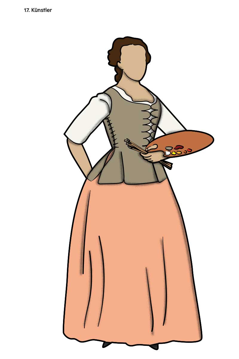 Die Besucher*innen begeben sich auf eine Zeitreise ins 18. Jahrhundert, wo sie auf einem historischen Grundriss durch das Mannheim Carl Theodors wandeln. Umgeben von Darstellungen vom barocken Mannheim nach einer zeitgenössischen Stichserie der Gebrüder Klauber (Bild links) begrüßen sie insgesamt 18 bekannte und weniger bekannte Zeitgenoss*innen als lebensgroße Figuren-Aufsteller. „Wir haben uns bemüht, verschiedene Typen zu zeigen. Sie alle erzählen aus ihrem Leben, außerdem gibt es Infos, Fun Facts und wenn möglich eine Kurzbiografie“, berichtet Throckmorton. Die Besucher*innen treffen auf einige konkrete historische Persönlichkeiten wie beispielsweise den Universal-Gelehrten und Leiter des Naturalienkabinetts Cosimo Alessandro Collini oder den Gastwirt Johann Heinrich Renner, der das Gasthaus „Pfälzer Hof“ am Paradeplatz betrieb, damals die feinste Adresse Mannheims. „Als historische Person ist auch die Malerin Catharina Treu sehr interessant“, berichtet Andreas Schenk, der sich mit der Biografie der Künstlerin befasst hat. „Der Kurfürst förderte sie intensiv und ließ ihr dabei erstaunlich viele Freiheiten, sodass sie sich als Künstlerin auch außerhalb des Hofes auf dem freien Kunstmarkt zu etablieren und ein sehr selbstbestimmtes Leben führen konnte.“
