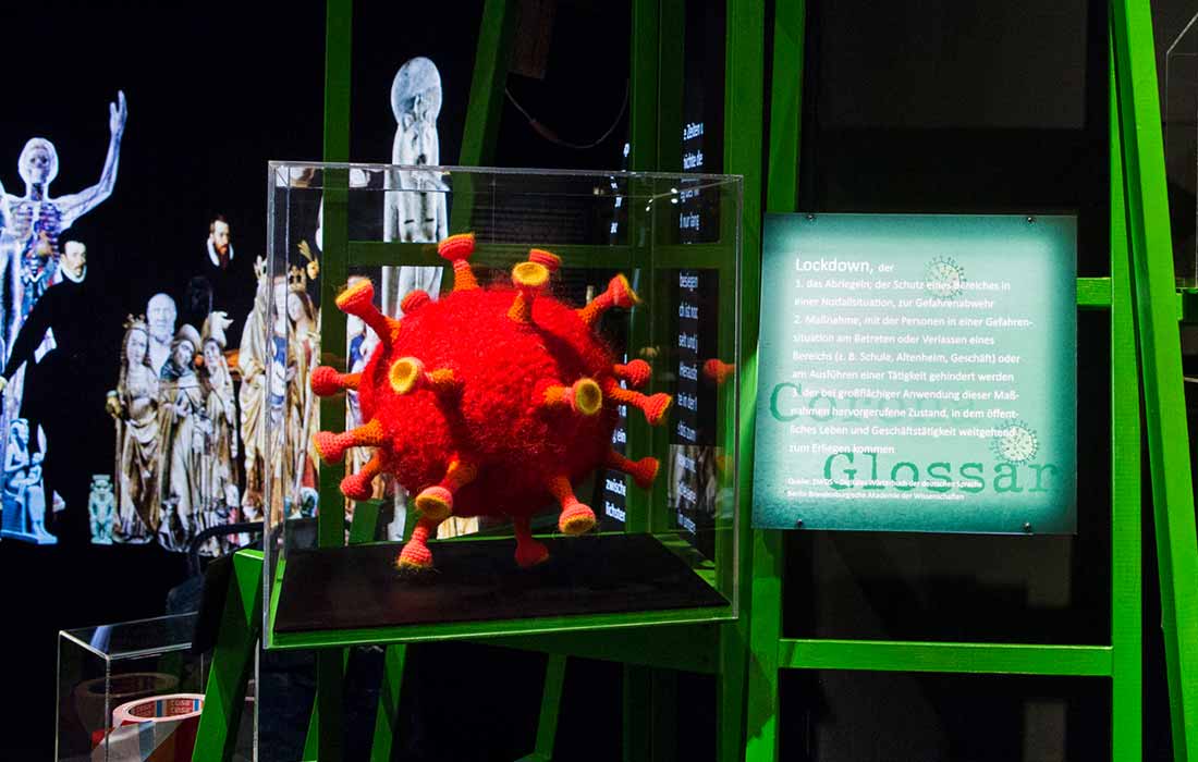 Die Medicus-Ausstellung im Historischen Museum der Pfalz, die 5.000 Jahre Medizingeschichte abbildet und eigentlich schon im Juni 2020 enden sollte, wurde während der Sommermonate des vergangenen Jahrs um elf sogenannte „Corona-Stationen“ erweitert. Diese dreidimensionalen Installationen widmen sich unterschiedlichsten Aspekten der Pandemie, ziehen sich einmal quer durch die Ausstellung und docken an den Erzählstrang der ursprünglichen Inszenierung an.