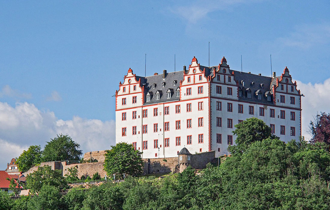 › Strahlend weiß mit roten Akzenten — Schloss Lichtenberg erhebt sich majestätisch über der malerischen Landschaft des Vorderen Odenwalds. Der vierflügelige Bau, der heute zur Gemeinde Fischbachtal gehört, ist seit Jahrhunderten eine unverwechselbare und weithin sichtbare Landmarke. Der ursprünglich unbewaldete, „lichte“ Hügel erschien den Grafen von Katzenelnbogen Anfang des 13. Jahrhunderts als idealer Standort für ihre Burg „uff dem lichten Berge“ — mit freiem Blick auf die Umgebung. Die territorialpolitische Bedeutung von Lichtenberg in dem von Kleinstaaterei geprägten Odenwald war damals so groß, dass sich Dieter IV. von Katzenelnbogen ab 1228 Graf von Lichtenberg nannte.