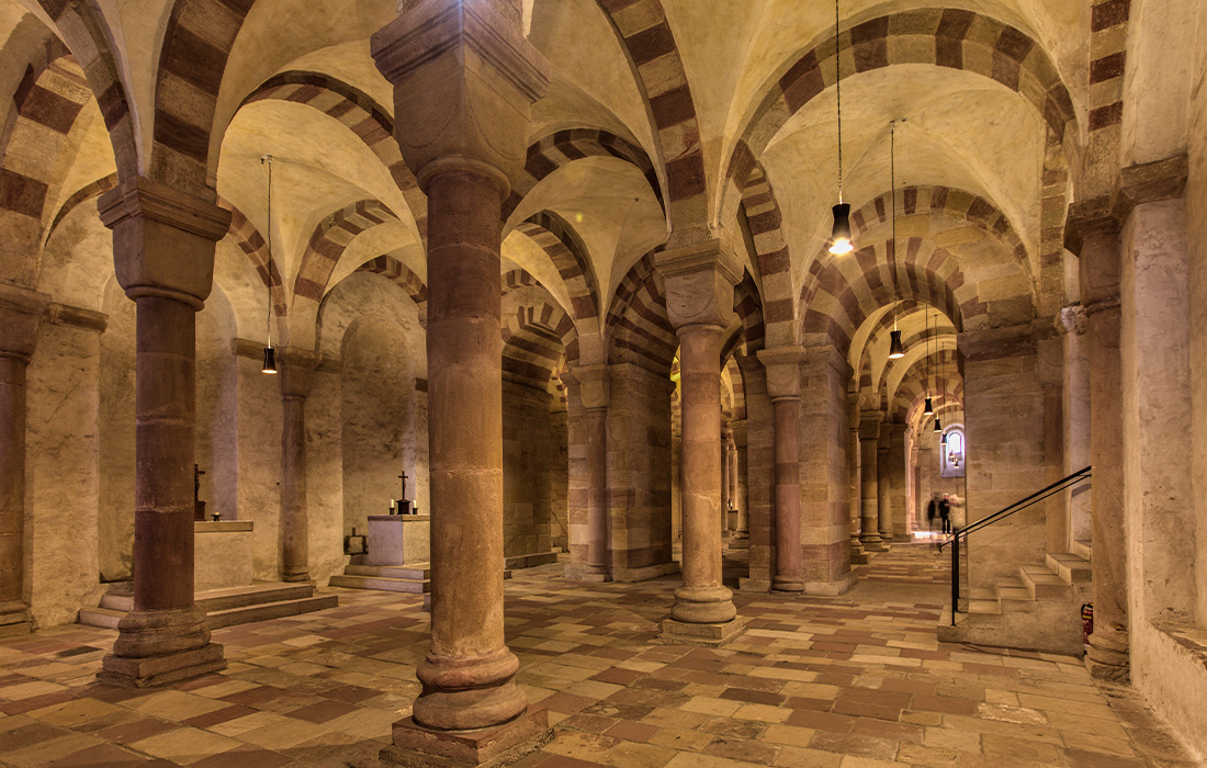 Um sie für Besucher*innen zugänglich zu machen, wurde im 20. Jahrhundert für die Kaiser- und Königsgräber eine eigene Gruft mit einem Zugang über die Krypta des Doms geschaffen. Die bei der Grabung den Sarkophagen entnommenen Grabbeigaben, unter anderem mehrere Grabkronen und der Reichsapfel Kaiser Heinrichs III., sind inzwischen im nur 200 Meter vom Dom gelegenen Historischen Museum der Pfalz in der Sammlung „Kreuz und Krone“ zu sehen, die sich der rund 1.500-jährigen Geschichte des Bistums Speyer widmet.Eine der schönsten Kryptas der WeltDie Krypta des Speyerer Doms und die Herrschergräber können ganzjährig besucht werden. Aufgrund ihrer Größe, ihrer klaren geometrischen Gliederung und des besonders hohen Gewölbes gilt die Speyerer Krypta tatsächlich als eine der schönsten der Welt. Als besonderes Schmankerl gewährt das Historische Museum der Pfalz den Besucher*innen, die ihr Krypta-Ticket vorzeigen, einen Rabatt für den Besuch der Sammlung „Kreuz und Krone“, die die einzigartigen Beigaben aus den Königs- und Kaisergräbern zeigt: Sie zahlen nur 6,50 statt 9 Euro Eintritt. Darüber hinaus bietet die kostenfreie App des Museums eine 50-minütige Highlight-Tour, mit der die Besucher*innen die Sammlung selbstständig erkunden können. ‹