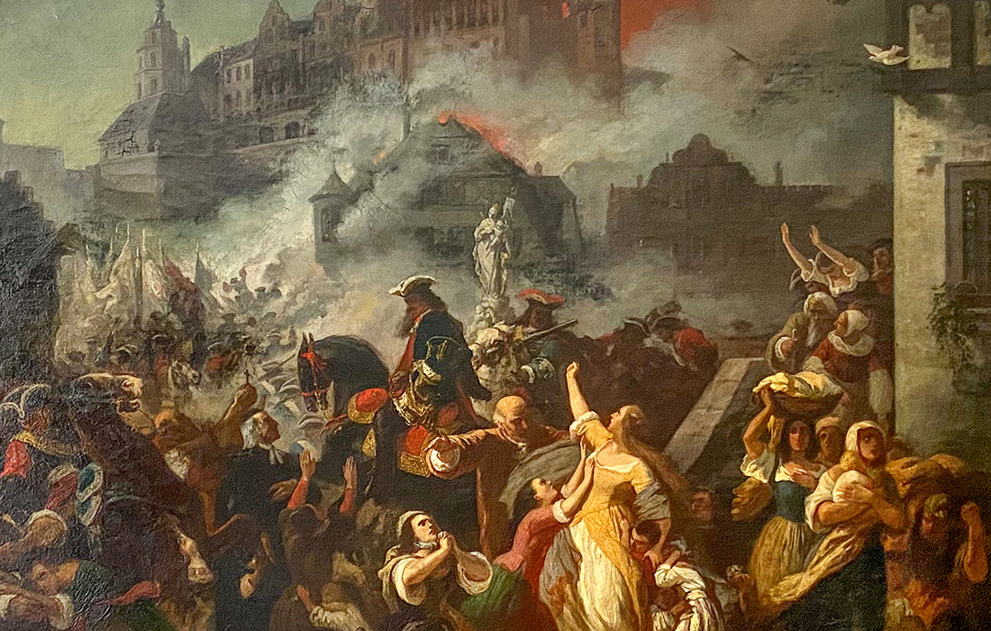 Feodor Dietz, „Die Zerstörung Heidelbergs durch Melac 1689“, 1868, Leihgabe und Foto: Museum der Stadt Weinheim;„Unlinger Reiter“, Leihgabe des Landesamts für Denkmalpflege Baden-Württemberg, Foto: Ginger Neumann; 8. Französischer Helm aus dem Heidelberger Kriegsgeschehen, Ende 17. Jahrhundert, 1975 gefunden am Heidelberger Schloss, Kurpfälzisches Museum, Foto: K. Gattner; 4. Keltischer Bronzehelm aus dem Rhein bei Mannheim, 1. Jh. v. Chr., Leihgabe des Badischen Landesmuseums Karlsruhe, Foto: Peter Gaul; 7. Als „Tillyfund“ bezeichnete archäologische Funde aus der Zeit der Eroberung Heidelbergs im Jahr 1622, Kurpfälzisches Museum, Foto: E. Kemmet; 6. Matthäus Merian, Belagerung und Eroberung Heidelbergs durch Tilly 1622, Druckgraphik (Detail), Original und Digitalisat: Kurpfälzisches Museum; „Elisabeth Charlotte“, Historisches Museum der Pfalz, Foto Julia PaulKurpfälzisches Museum