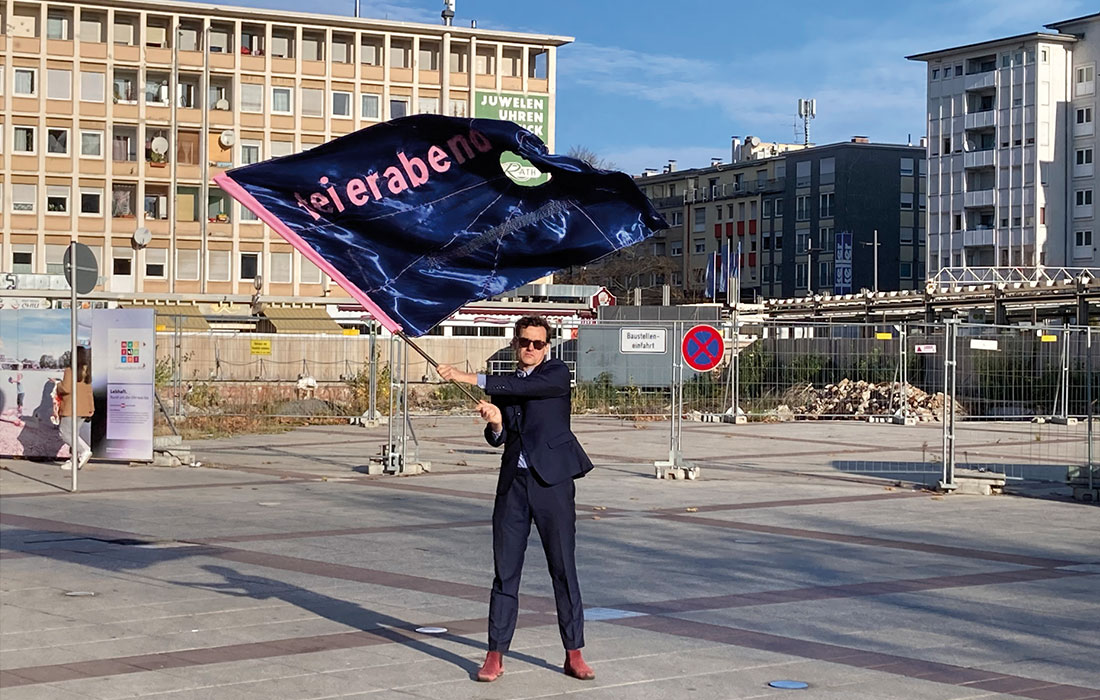 Armin Chodzinski ist auf Achse. Mit einer bunten Flagge, die der Schriftzug „Feierabend“ ziert, posiert der Hamburger Künstler an verschiedenen Orten in Ludwigshafen und Umgebung — auf dem Berliner Platz, vor dem Rheinpfalz-Hochhaus, neben der Arbeitsagentur oder auf einem Feld mit der Silhouette der BASF im Hintergrund. „Das sind Orte, die alle irgendwie mit dem Thema Feierabend zu tun haben“, erklärt Chodzinski. Die Fotografien bilden Motive einer Postkarten-Serie, die Chodzinski zum Auftakt seines Daseins als BASF-Werkskünstler verteilt hat. „Ich möchte die Leute dazu animieren, mit mir ihre Gedanken, Anekdoten und Fundstücke zum Thema zu teilen.“