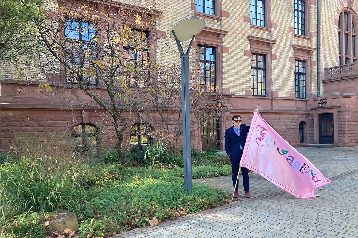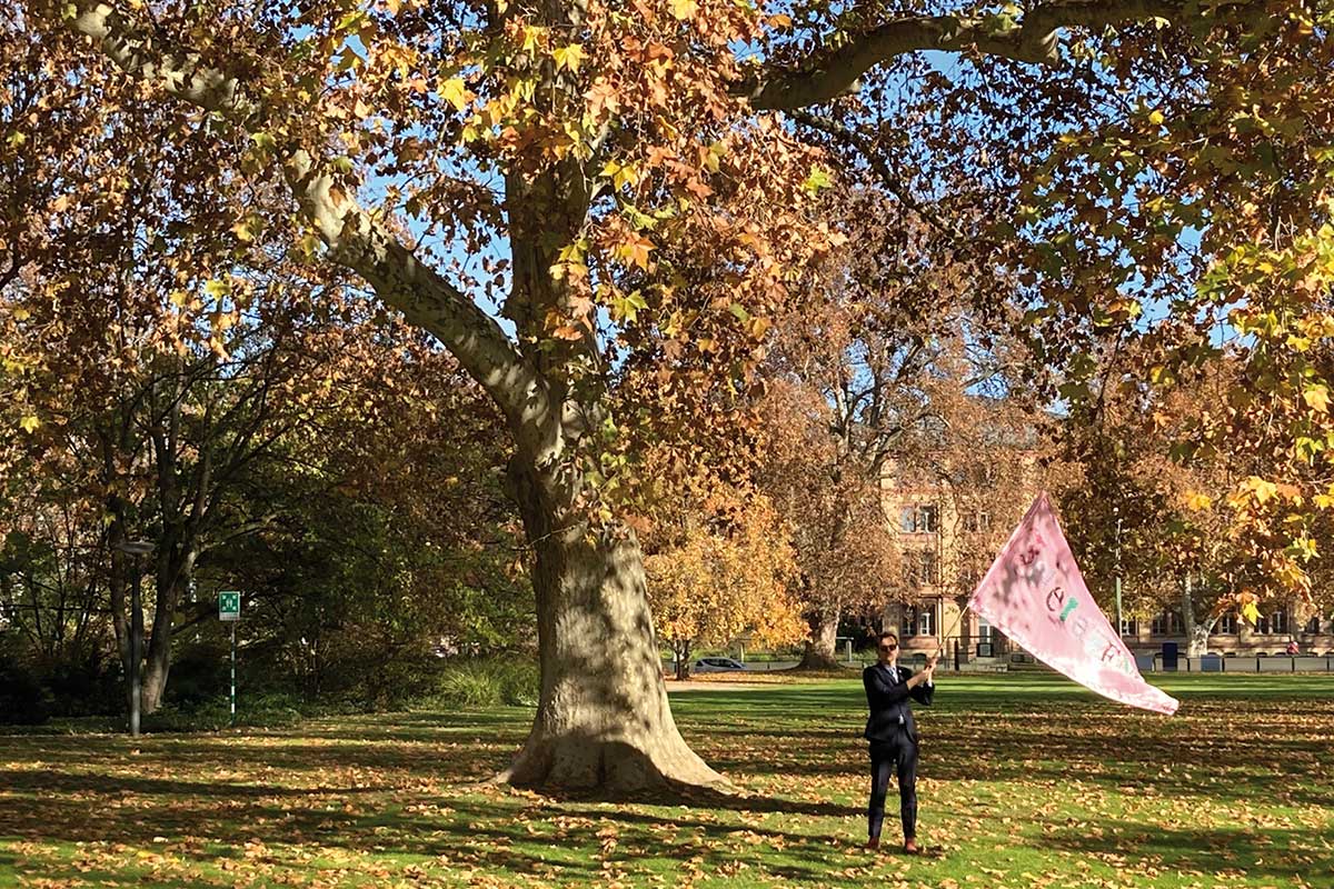 Armin Chodzinski ist auf Achse. Mit einer bunten Flagge, die der Schriftzug „Feierabend“ ziert, posiert der Hamburger Künstler an verschiedenen Orten in Ludwigshafen und Umgebung — auf dem Berliner Platz, vor dem Rheinpfalz-Hochhaus, neben der Arbeitsagentur oder auf einem Feld mit der Silhouette der BASF im Hintergrund. „Das sind Orte, die alle irgendwie mit dem Thema Feierabend zu tun haben“, erklärt Chodzinski. Die Fotografien bilden Motive einer Postkarten-Serie, die Chodzinski zum Auftakt seines Daseins als BASF-Werkskünstler verteilt hat. „Ich möchte die Leute dazu animieren, mit mir ihre Gedanken, Anekdoten und Fundstücke zum Thema zu teilen.“