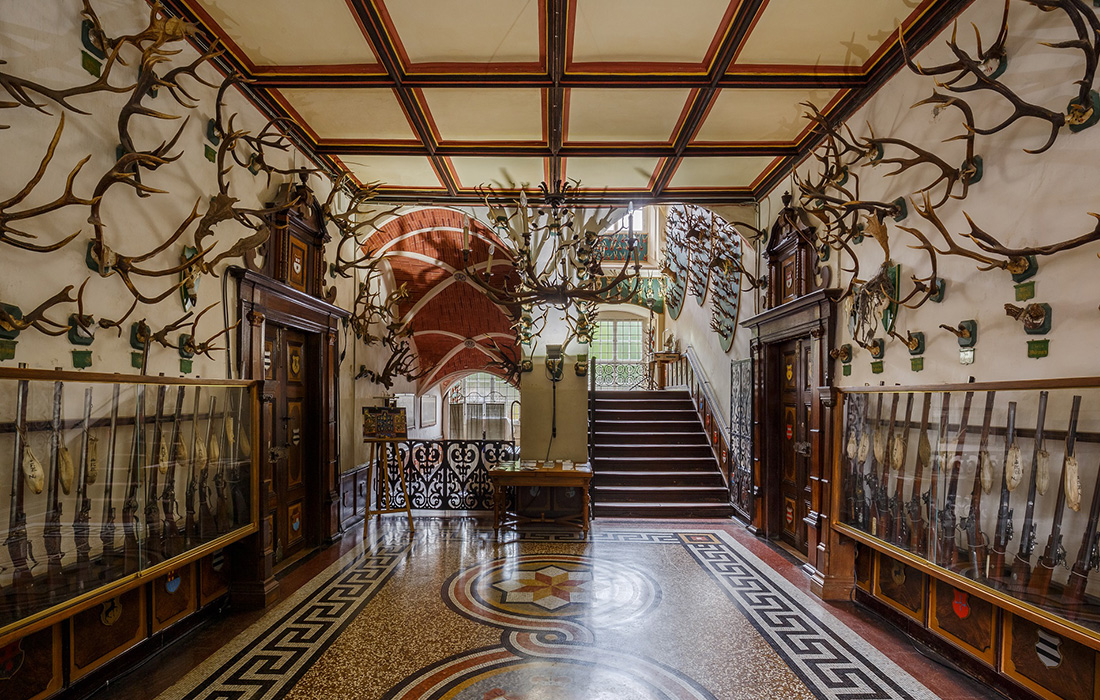 Franz I. interessierte sich nicht nur für die Antike, wenngleich er von ihr als dem „Lieblingsfache meiner Nebenzeit“ sprach. Parallel zu seinen Regierungsgeschäften als Landesherr einer Grafschaft baute er die Waffensammlung seiner Vorfahren aus und sammelte Rüstungen, Glasmalereien sowie kolossale und abnorme Geweihe. Von den 1790er-Jahren an ließ er die Innenräume des Schlosses umgestalten, um den Objekten einen würdigen Rahmen zu geben. Noch heute sind seine umfangreichen Kollektionen von Waffen und Rüstungen in dem beeindruckenden neogotischen Rittersaal und der Gewehrkammer zu besichtigen. Die naturhistorische Geweihsammlung begrüßt die Schlossbesucher*innen bereits im Vestibül. Sie säumt das Treppenhaus und entfaltet ihre Pracht mit besonders beeindruckenden Exemplaren in der großen Hirschgalerie. Die Gehörne konnte Franz nicht mehr zu Lebzeiten in seinem Schloss präsentieren. Sein heutiges Erscheinungsbild verdankt der Ausstellungssaal seinem Enkel Eberhard XV. (1818–1884), der im Sinne seines Großvaters Mitte des 19. Jahrhunderts die Geweihe aus anderen Jagdhäusern dorthin brachte.Ein einzigartiger GlücksfallAm Ende seines Lebens übertrug Franz I. schließlich eine große Verantwortung auf seinen ältesten Sohn Carl (1782–1832): „Was einst von diesen Gegenständen, / Geliebter Carl, aus meinen Händen in / Deine Hände übergeht, / Das werde, wenn gleich nicht erweitert/ Doch nie verstossen und verschleudert (…) / So pfleg du, Freund von schönen Tönen, / Auch diese Sammlungen des Schönen, / so schütze, und erhalte sie!“