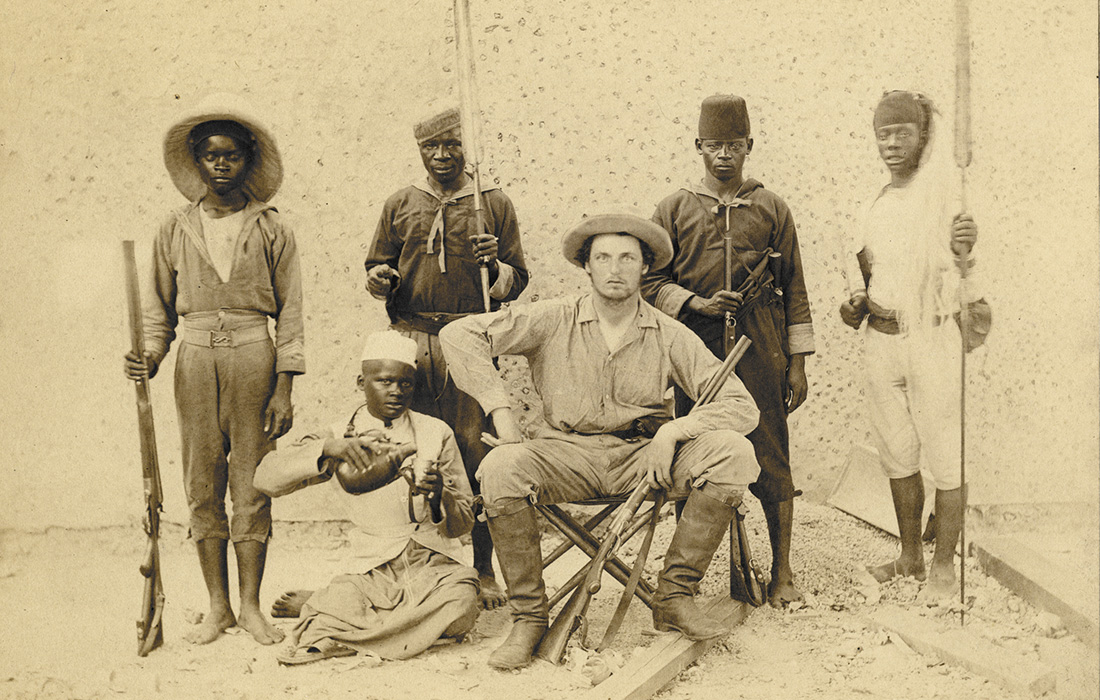 Theodor Bumiller in kolonialer Pose mit ungenannten Soldaten und Teilnehmern einer Militärexpedition in Deutsch-Ostafrika, zw. 1889-1893 / Elefantenstoßzahn als Geschenk des ostafrikanischen Sklaven- und Elfenbeinhändlers Tippu-Tip an Theodor Bumiller in der Weltkulturen-Sammlung der Reiss-Engelhonr-Museen; mit alter Ausstellungsmontage aus den 1920er/30er JahrenReiss-Engelhorn-Museen