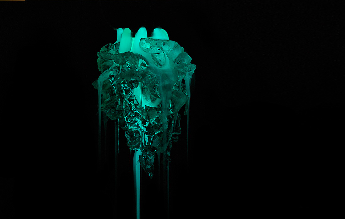 › Sternenrotz — bereits mit diesem Titel aus zwei Wörtern, die scheinbar nicht zusammenpassen, knipst Thomas Feuerstein das Kopfkino an. Doch was stellt die Installation des österreichischen Konzept- und Medienkünstlers dar? Einen geheimnisvoll glühenden Körper, der organisch anmutet. Rein stofflich handelt es sich um phosphoreszierenden Schleim, der sich über ein Glasobjekt ausbreitet. Es ist beinahe unmöglich, zwischen diesem und dem Schleim selbst zu unterscheiden, denn die Skulptur befindet sich in einem ständigen Wandel und wirkt dabei faszinierend und abschreckend zugleich. Einerseits zieht die Leuchtkraft der zähflüssigen Masse die Aufmerksamkeit nahezu magisch auf sich. Andererseits löst sie subtilen Horror aus. Sternenrotz und SchutzhütteMit „Sternenrotz“ verweist der Künstler auf eine Vorstellung, die seit dem 15. Jahrhundert besteht. Sie bringt unerklärbare Naturphänomene gallertartiger Substanz mit Meteoren-Schauern, also mit vom Himmel gefallenen Objekten, in Verbindung. Der Untertitel „Kinoskulptur“ weckt die Erwartung auf einen Film, die jedoch nicht erfüllt wird. Anstelle dessen wird das von Feuerstein verfasste Hörstück „Sternenrotz. Daimon Cult“ eingespielt. Es erzählt in etwa 100 Minuten die Geschichte mehrerer Wissenschaftler, die sich mit der Frage unserer Herkunft beschäftigen. Ein 28-teiliger Grafikzyklus bebildert die Erzählung.