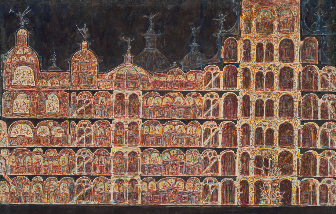 Für Thomas Röske, den Leiter der Sammlung Prinzhorn, ist ein positiver Nebeneffekt von Themenausstellungen, dass auch weniger bekannte Schätze ausgegraben werden. „Wir waren überrascht, wie viele Blätter wir gar nicht im Kopf hatten oder noch nie im Zusammenhang mit Architektur wahrgenommen haben.“ Dazu zählen für den profunden Kenner der Outsider Art die poetische Darstellung von Landschaft, Architektur und Figur von Stefan Klojer, einem Weber, der in die Regensburger Anstalt eingewiesen wurde und dessen surreale Bilder alle vor dem Ersten Weltkrieg entstanden. Fast die Hälfte der in der Schau präsentierten Werke war niemals zuvor zu sehen.