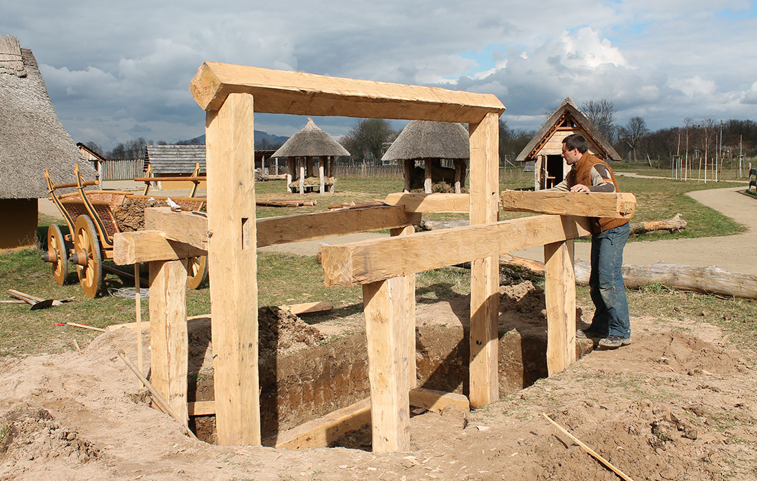 So arbeitet das Ochsengespann auf dem Acker. Es wird gewebt und Stoff gefärbt. Regelmäßig nimmt auch die rekonstruierte Schmiede ihren Betrieb auf — und zwar genau so wie vor 1.200 Jahren. Im Moment entsteht gerade ein neues Haus. Wie auch die anderen Bauten wird es ausschließlich mit den in der damaligen Zeit zur Verfügung stehenden Mitteln errichtet. Es soll später die Werkstatt eines Knochenschnitzers beherbergen.