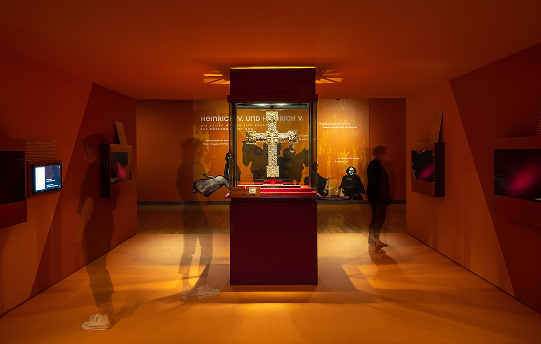 › Etwas mystisch ist der Einstieg in den mittelalterlichen Machtkosmos: Ein dunkler Saal, in dem sakrale Gesänge zu hören sind, im Zentrum stehen drei beleuchtete Exponate, drei Stuhl- bzw. Thronfragmente. Sie begrüßen zur Landesausstellung „Die Kaiser und die Säulen ihrer Macht“ — und dies natürlich nicht zufällig: „Throne sind die sichtbaren Zeichen eines Einzelnen über viele und führen so symbolisch sehr schön in unser Thema ein“, erklärt Birgit Heide, Direktorin des Landesmuseums Mainz. Zusammen mit Bernd Schneidmüller, Geschichtsprofessor an der Universität Heidelberg, hat sie die wissenschaftliche Leitung der Ausstellung inne, die zusammen mit vielen Partner-Institutionen und wissenschaftlichen Expert*innen aus dem In- und Ausland konzipiert wurde.