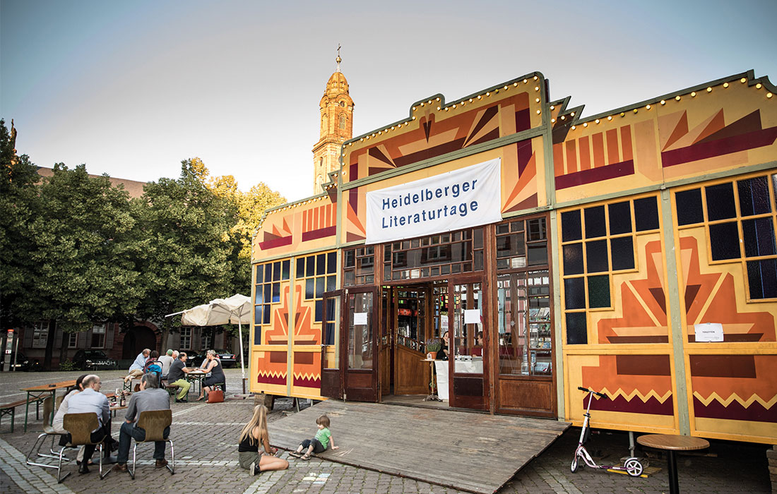 › Seit 24 Jahren ist das rot-gelbe Jugendstilzelt im Juni ein fester Bestandteil des Heidelberger Stadtbildes. Das ehemalige „Danspaleis“ mit seinen verspiegelten Holzsäulen verwandelt sich für fünf Tage in eine kleine Buchmesse, ein Festzelt, eine Lese-, Diskussions- und Performance-Bühne. Mehr als 30 Veranstaltungen mit ganz unterschiedlichem Charakter richten sich sowohl an große als auch kleine Literaturfans.