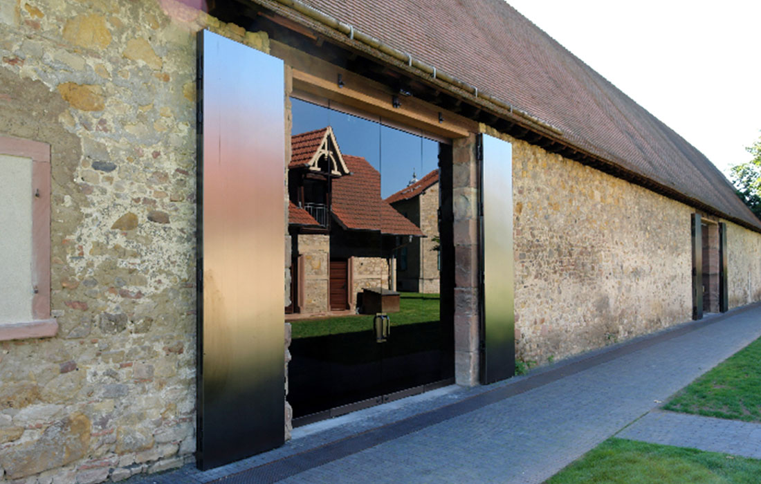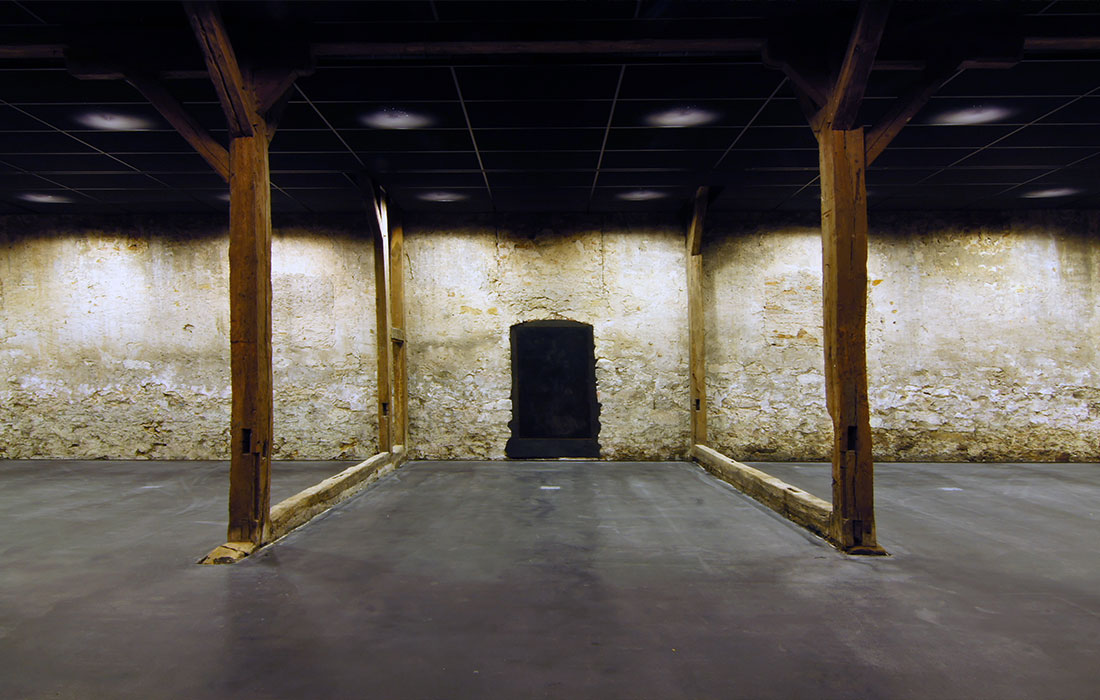 > Der Betonboden ist dunkel, die neu eingezogene Decke schwarz. Wer durch die massive Stahltür in das Innere des Gebäudes tritt, fühlt sich wie in einer Black Box. Nur ein paar Lichtspots erhellen während der Führung einzelne Steinfragmente. Viel Stahl, Eichenholz und Glas wurde hier verwendet. Diese Materialien wirken nicht nur sehr ästhetisch, sie erinnern auch an die frühere, durchaus profane Nutzung dieses Raums — als Depot und Lagerstätte. Diesen Eindruck zu erhalten war eines der Hauptanliegen des Architekturbüros Sichau & Walter in Fulda. Der stattliche Bau im Südwesten des Klostergeländes fungierte einst als Zehntscheune, jetzt dient er als Ausstellungsort. „Wo der Pflug hingeht, geht auch der Zehnt hin.“Nicht umsonst heißt es in einem christlichen Lied: „Wo der Pflug hingeht, geht auch der Zehnt hin.“ Seit dem Altertum galt es als üblich, dass Bauern eine etwa zehnprozentige Steuer in Form von Geld oder Naturalien an Tempel, Kirche oder weltliche Gutsherren, Fürsten und Könige zu entrichten hatten. So war das auch Ende des 16. Jahrhunderts in der Kurpfalz, als die Lorscher Zehntscheune entstand — ein Gebäude von stolzen 80 Metern Länge. Beeindruckend sind nicht nur ihre Ausmaße, sondern auch der Zeitpunkt der Erbauung: Das Kloster wurde 1557 aufgehoben, die Zehntscheune in den 1590er-Jahren errichtet. Die abgabepflichtigen Höfe der Umgebung zahlten ihren Zehnt damals mit Getreide. Noch heute zeugen die Holzbalken im Inneren des Baus von seiner ursprünglichen Nutzung als Speicher. Dass dieses Gebäude seit März 2016 Besucherinnen und Besuchern des Klosters Lorsch als Schaudepot offen steht, ist dem Investitionsprogramm der Nationalen UNESCO-Weltkulturerbestätten sowie dem Kulturinvestitionsprogramm des Landes Hessen zu verdanken. Mit diesen Mitteln wurde in