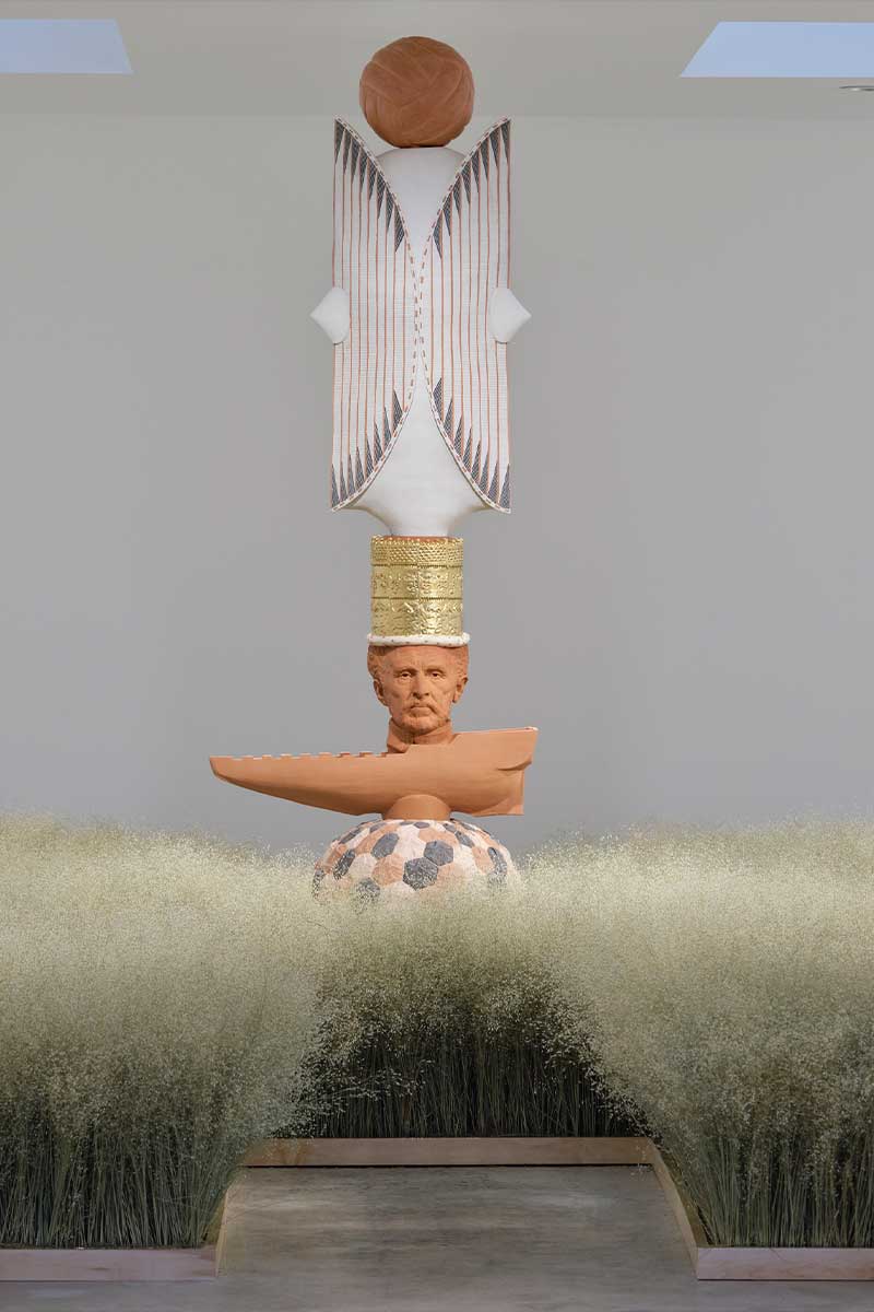 • Tavares Strachan: There Is Light Somewhere. Jah Rastafari with Rice Field (Stacked with Pineapple, Shield and Football), 2023.© Marc Blower. Courtesy the artist and the Hayward Gallery