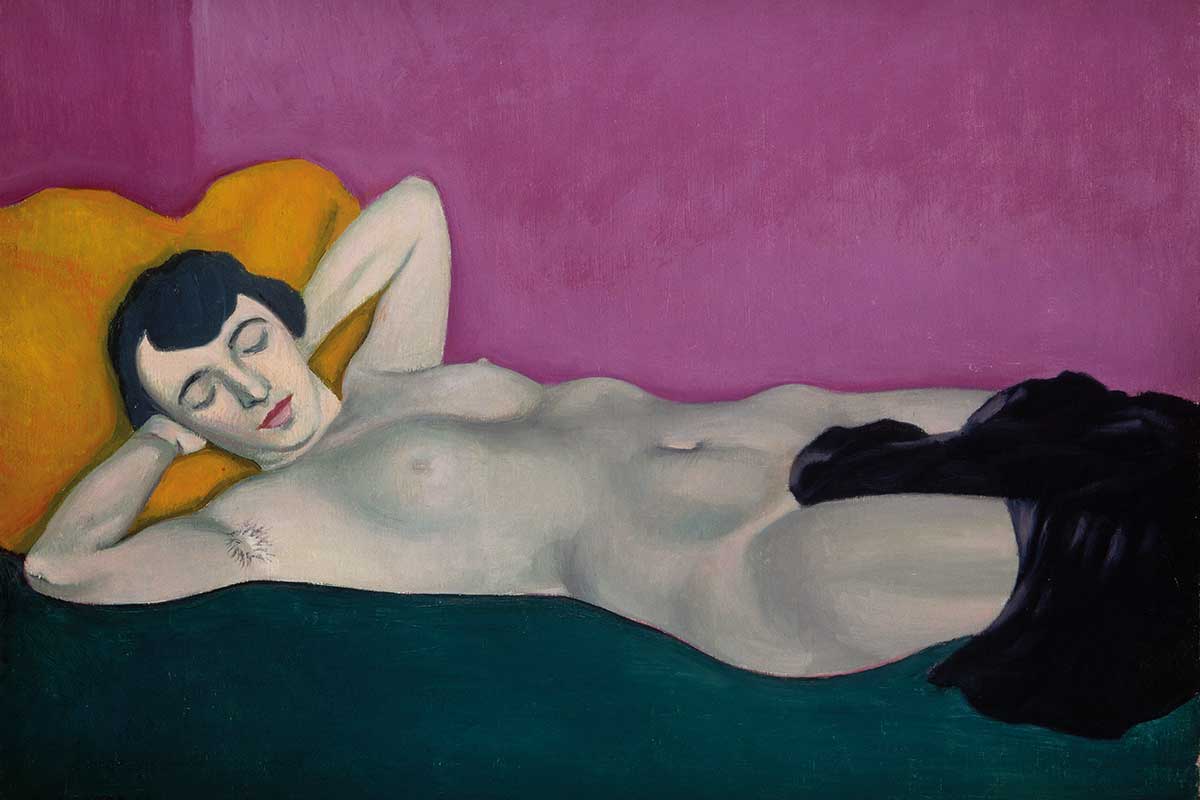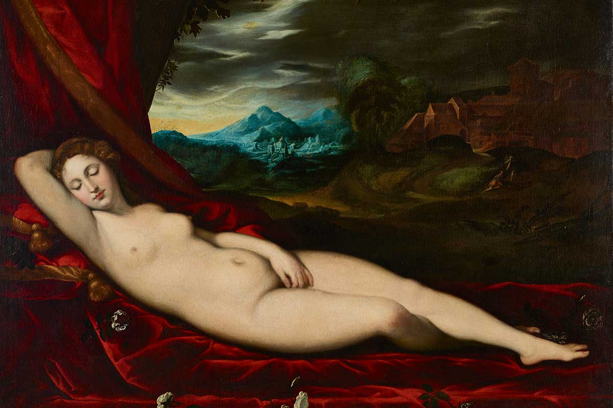 Jenna Gribbon: Me, a Lurker, 2020, Öl auf Leinwand, Privatsammlung, Deutschland© VG Bild-Kunst, Bonn 2021, Foto: Ludger Paffrath (Aufmacher) / Tizian-Nachfolge: Schlummernde Venus, 1580/1600, Öl auf Leinwand, Hessisches Landesmuseum Darmstadt