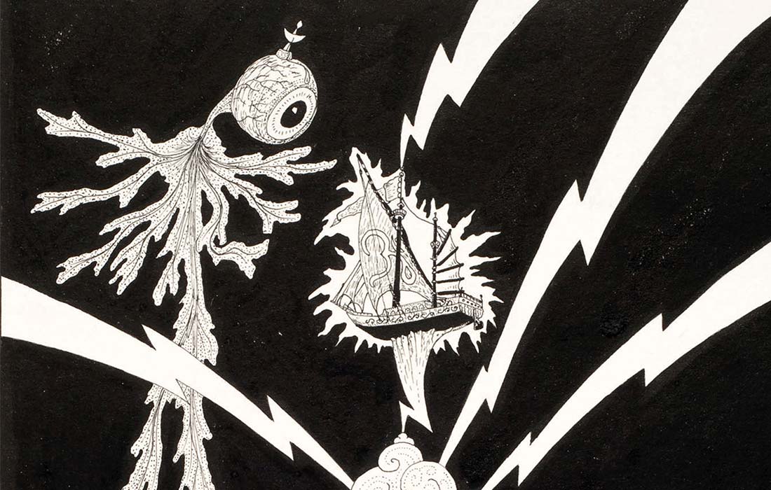 Preview/Slider: Hans Wühr, ohne Titel, 1920, Sammlung Prinzhorn; Aufmacher: M. St., „The Hill of Meru“, 1976, Sammlung Prinzhorn