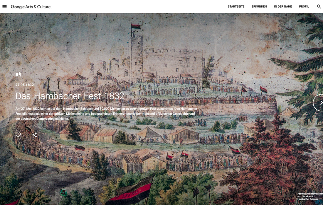› Mit 1.000 Besuchern rechneten die Veranstalter des Hambacher Festes im Jahr 1832. Rund 30.000 Menschen aus ganz Europa kamen, um liberale und demokratische Ideen zu diskutieren und zusammen friedlich zu feiern. Eigene Merchandising-Produkte, mächtige Gegner, die das Fest bis zuletzt verhindern wollten, Gesänge, Getrommel und buntes Festtreiben — zahlreiche Geschichten ranken sich um das Hambacher Fest und machen es zu weit mehr als einem verstaubten Datum aus dem Geschichtsbuch. Erlebbar wird dies in der multimedialen Ausstellung am Originalschauplatz oder seit Kurzem auch im Netz auf der neuen Google-Arts-&-Culture-Seite. Virtueller 360°-Rundgang