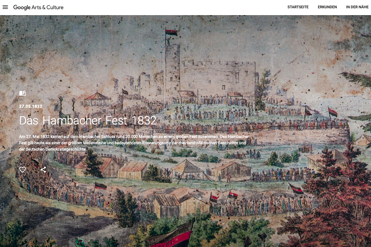 › Mit 1.000 Besuchern rechneten die Veranstalter des Hambacher Festes im Jahr 1832. Rund 30.000 Menschen aus ganz Europa kamen, um liberale und demokratische Ideen zu diskutieren und zusammen friedlich zu feiern. Eigene Merchandising-Produkte, mächtige Gegner, die das Fest bis zuletzt verhindern wollten, Gesänge, Getrommel und buntes Festtreiben — zahlreiche Geschichten ranken sich um das Hambacher Fest und machen es zu weit mehr als einem verstaubten Datum aus dem Geschichtsbuch. Erlebbar wird dies in der multimedialen Ausstellung am Originalschauplatz oder seit Kurzem auch im Netz auf der neuen Google-Arts-&-Culture-Seite. Virtueller 360°-Rundgang