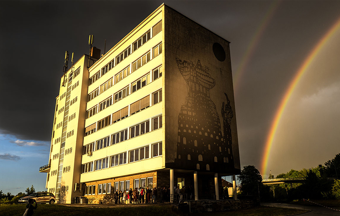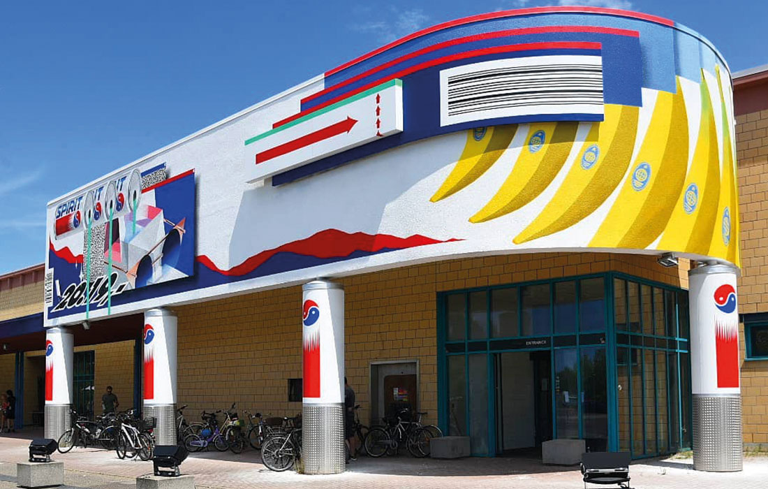 Einen Steinwurf von der Autobahn entfernt zwischen Schwetzingen und Heidelberg liegt das Patrick-Henry-Village, ehemaliger Stützpunkt amerikanischer Soldaten. Im Süden dieses Areals befindet sich ein verwaister Supermarktparkplatz: Durch die Ritzen im Asphalt sprießen Gräser und anderer Wildwuchs. Der Blick fällt auf eine auffällig bemalte Fassade. Aus überdimensionalen Getränkedosen mit dem Schriftzug „Spirit“ fließt eine giftgrüne Flüssigkeit, riesige quietschgelbe Bananen empfangen alle, die die Türen des ehemaligen Supermarktes passieren. „Das entstand im Rahmen unseres Festivals 2019“, erklärt Pascal Baumgärtner, Erfinder und Kurator von METROPOLINK. Mit einem Knarren öffnet er die Eingangstür und legt drinnen den Generalschalter um, zu sehen sind zuckende Überbleibsel von Leuchtschrift über gigantischen Kühltruhenskeletten. Angefangen hat METROPOLINK als Street-Art-Festival in der gesamten Metropolregion. Mittlerweile ist es aber zu einem viel größeren Projekt geworden, wie Baumgärtner erklärt: „Wir wollen hier unseren Superstore eröffnen, einen Ort für Künstlerinnen und Künstler aus der Region und der ganzen Welt, wo jeder kreativ sein kann. Das Wichtigste dabei ist, dass sich alle, die hier arbeiten, so richtig frei fühlen können.“ Während der Verkaufsraum des PX noch eher einem Stranger-Things-Filmset ähnelt, sieht man in dem endlosen Flur auf dem Weg zur eigentlichen METROPOLINK-Schaltzentrale, der ehemaligen Waren-Anlieferhalle, schon Lebenszeichen einer Nutzung: Vergangenen Sommer gab es schon einmal einen ersten Vorgeschmack, die Künstler campierten in den leerstehenden Häusern vor Ort, es gab leckeres Essen und coole Drinks, lange Partynächte, Lesungen und natürlich jede Menge Street-Art mit Szenegrößen aus der ganzen Welt.