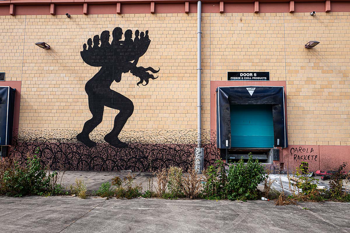 Einen Steinwurf von der Autobahn entfernt zwischen Schwetzingen und Heidelberg liegt das Patrick-Henry-Village, ehemaliger Stützpunkt amerikanischer Soldaten. Im Süden dieses Areals befindet sich ein verwaister Supermarktparkplatz: Durch die Ritzen im Asphalt sprießen Gräser und anderer Wildwuchs. Der Blick fällt auf eine auffällig bemalte Fassade. Aus überdimensionalen Getränkedosen mit dem Schriftzug „Spirit“ fließt eine giftgrüne Flüssigkeit, riesige quietschgelbe Bananen empfangen alle, die die Türen des ehemaligen Supermarktes passieren. „Das entstand im Rahmen unseres Festivals 2019“, erklärt Pascal Baumgärtner, Erfinder und Kurator von METROPOLINK. Mit einem Knarren öffnet er die Eingangstür und legt drinnen den Generalschalter um, zu sehen sind zuckende Überbleibsel von Leuchtschrift über gigantischen Kühltruhenskeletten. Angefangen hat METROPOLINK als Street-Art-Festival in der gesamten Metropolregion. Mittlerweile ist es aber zu einem viel größeren Projekt geworden, wie Baumgärtner erklärt: „Wir wollen hier unseren Superstore eröffnen, einen Ort für Künstlerinnen und Künstler aus der Region und der ganzen Welt, wo jeder kreativ sein kann. Das Wichtigste dabei ist, dass sich alle, die hier arbeiten, so richtig frei fühlen können.“ Während der Verkaufsraum des PX noch eher einem Stranger-Things-Filmset ähnelt, sieht man in dem endlosen Flur auf dem Weg zur eigentlichen METROPOLINK-Schaltzentrale, der ehemaligen Waren-Anlieferhalle, schon Lebenszeichen einer Nutzung: Vergangenen Sommer gab es schon einmal einen ersten Vorgeschmack, die Künstler campierten in den leerstehenden Häusern vor Ort, es gab leckeres Essen und coole Drinks, lange Partynächte, Lesungen und natürlich jede Menge Street-Art mit Szenegrößen aus der ganzen Welt.