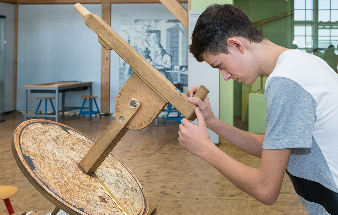 Sonnenuhren und PlanetenmodelleHauptinstrument in der Sternwarte war der Mauerquadrant, mit dem sich die Position von Gestirnen bestimmen ließ — wahres Hightech der damaligen Zeit und mit seinem 2,6 Meter langen Fernrohr und 450 Kilogramm Gewicht auch ein beeindruckendes Objekt. Zu sehen ist dieser Mauerquadrant heute im TECHNOSEUM, das das historische Inventar der Sternwarte aufbewahrt. In einem eigenen Ausstellungsbereich geben Fernrohre, Himmels- und Erdgloben, Sonnenuhren und Planetenmodelle Einblicke in die bahnbrechende Sternenkunde vor 250 Jahren. An interaktiven Stationen können die Besucher*innen auch selbst Sterne entdecken und herausfinden, wie die Mondphasen entstehen. ‹